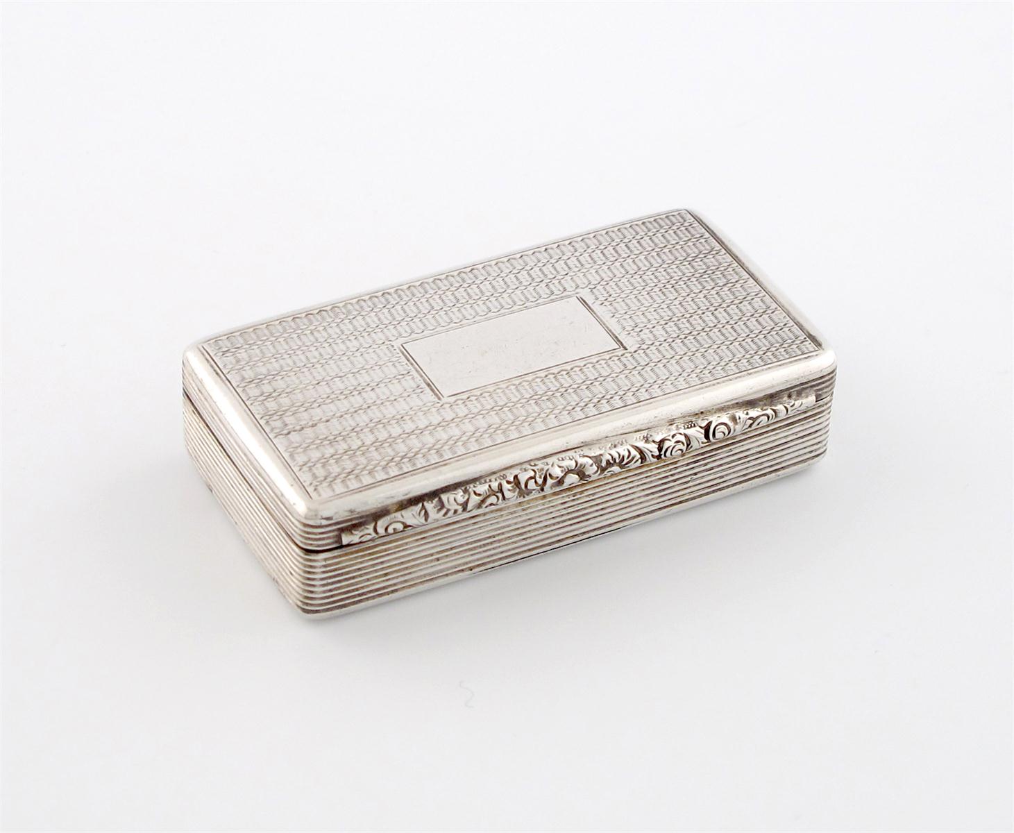rectangular form, engine-turned decoration, the hinged cover with a vacant cartouche, foliate scroll thumb-piece, length 7.2cm, approx. weight 2.4oz.