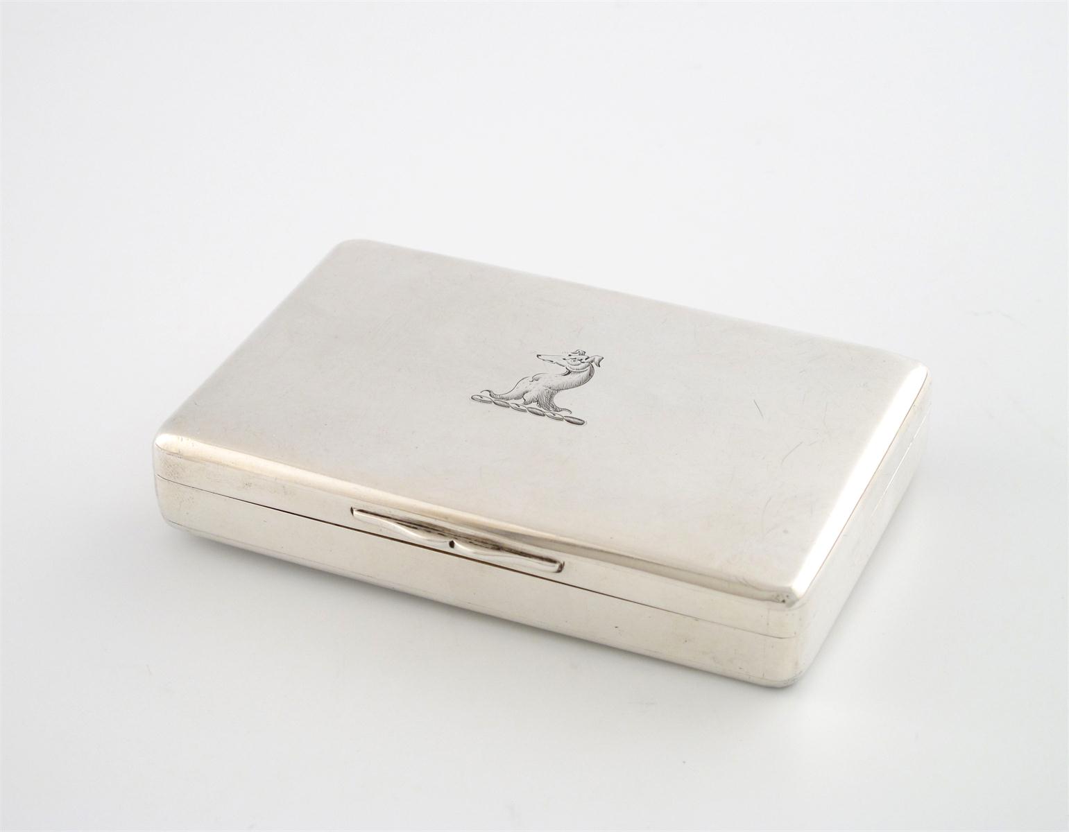 plain rectangular form, the hinged cover engraved with a crest, plain thumb-piece, length 10.7cm, approx. weight 5oz.