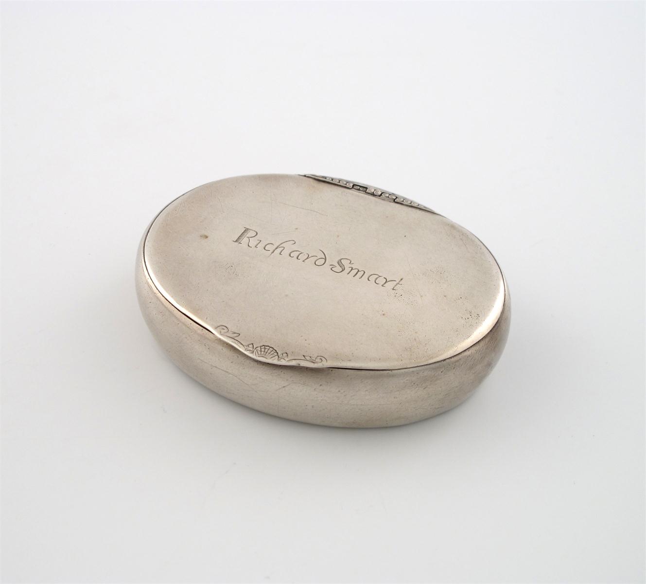 oval form, the hinge with engraved decoration, the cover engraved 'Richard Smart', length 9.8cm, approx. weight 4oz.
