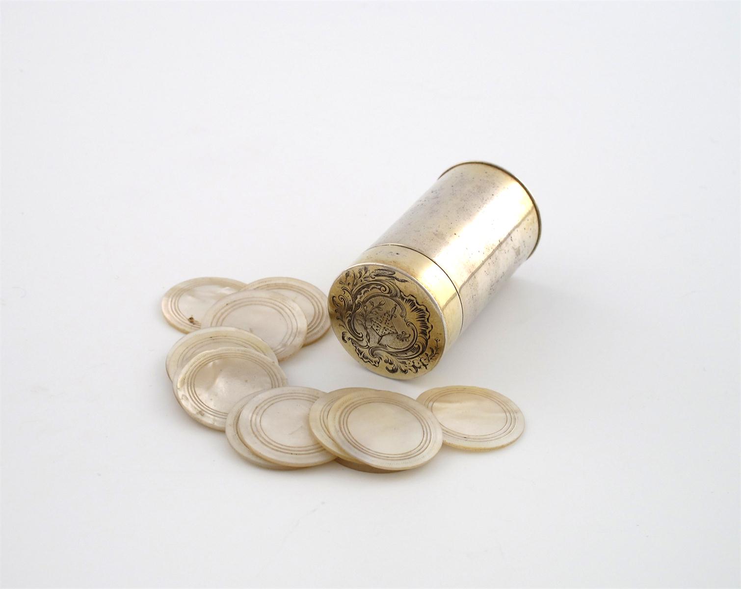 cylindrical form, the pull-off cover engraved with an armorial, with twelve mother-of-pearl counters, height 5.3cm, approx. weight 1.4oz.