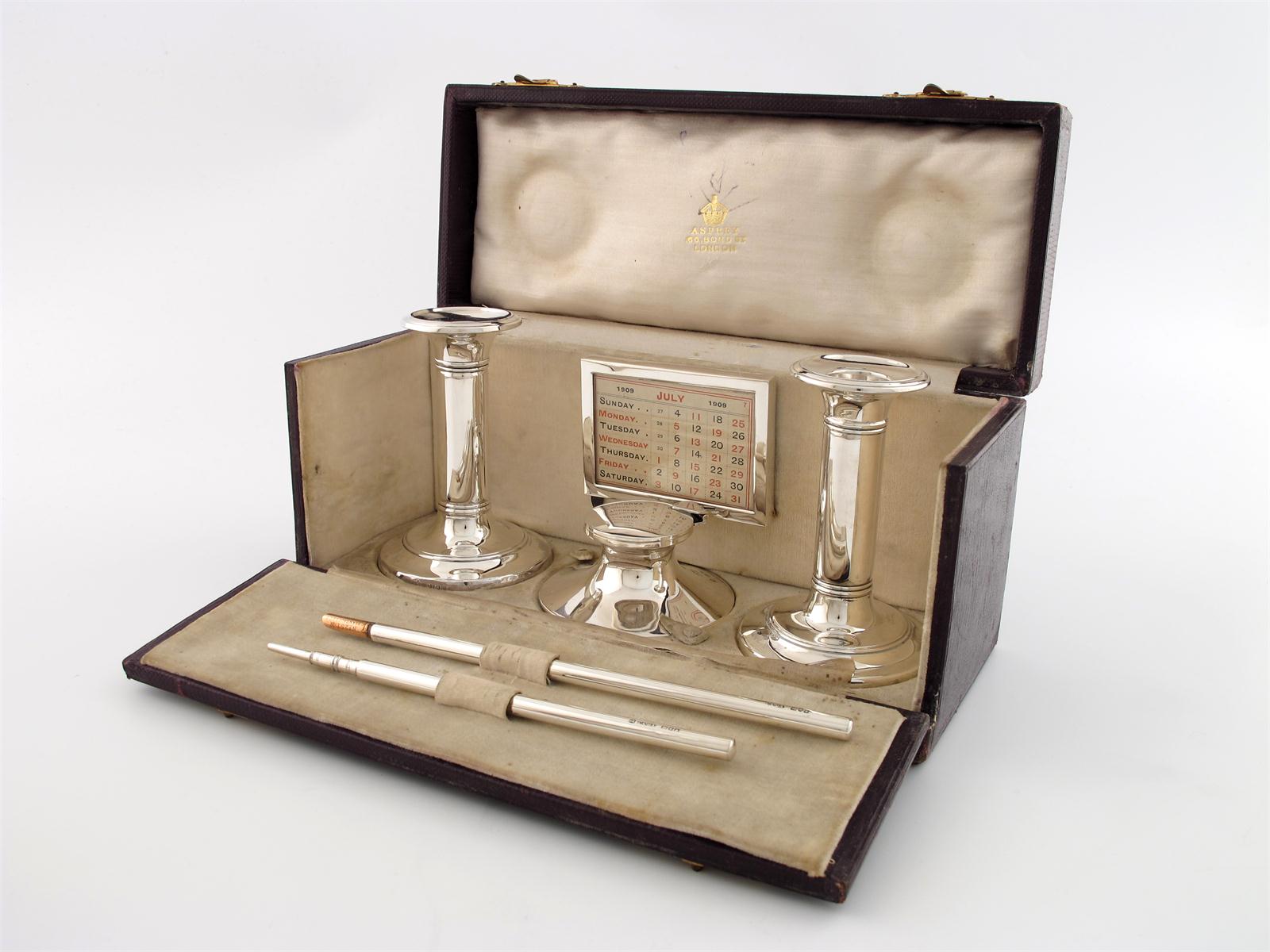 comprising: a pair of candlesticks, a capstan inkwell, a calendar, plus a pen and pencil, in a fitted case, height of candlestick 9.5cm.