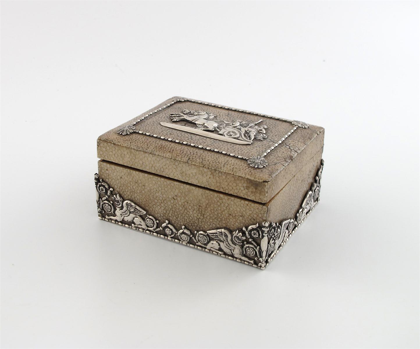 rectangular form, the hinged cover applied with a chariot within a border, the base with pierced classical mounts, the inside tortoiseshell lined, length 11.4cm.