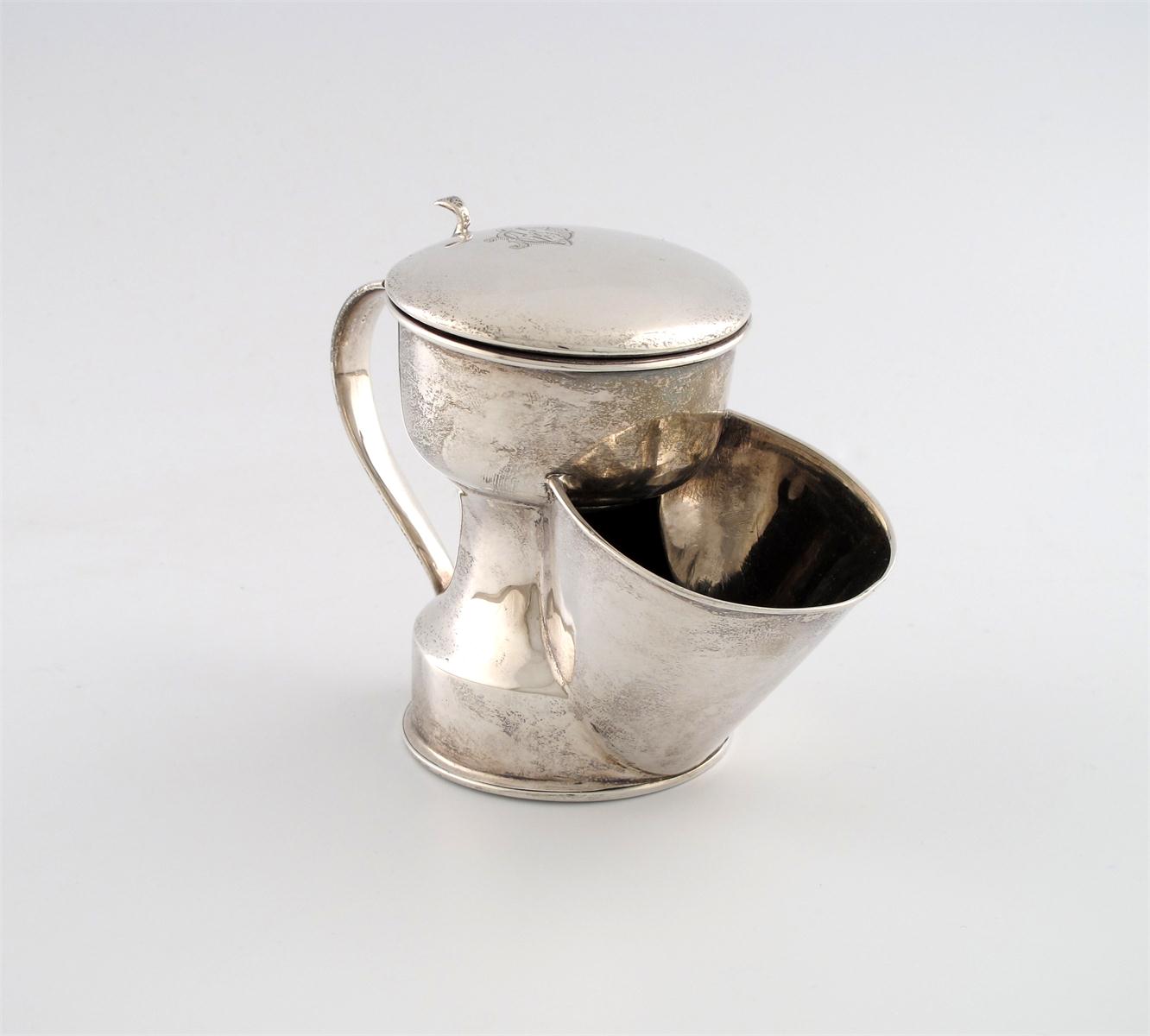 circular form, reeded scroll handle, domed hinged cover with a monogram, the cover opens to reveal a hinged brush holder, on a circular foot, height 11.5cm, approx. weight 10oz.