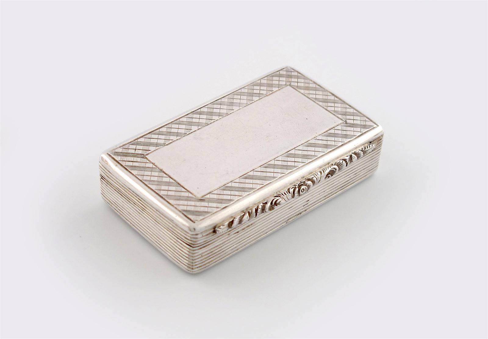 rectangular form, reeded sides, the hinged cover and base with tartan decoration, the hinged cover with a vacant cartouche, foliate scroll thumb-piece, length 6.5cm, approx. weight 2.1oz.