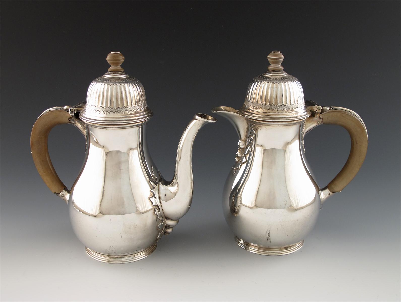 baluster form, the spouts and handles with cut-card decoration, domed hinged fluted covers with knop finials, scroll handles, on raised circular bases, height 21.8cm, approx. weight 45oz. (2)