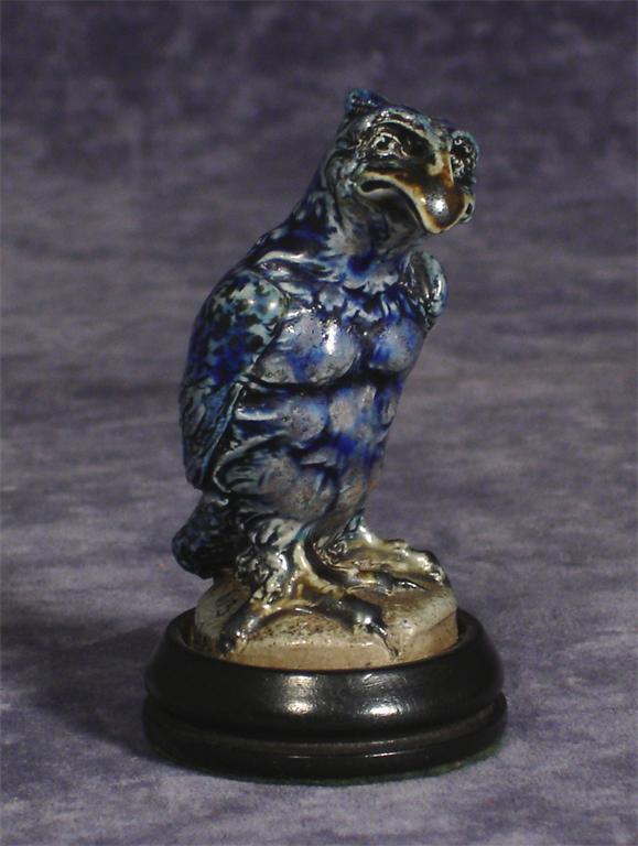 A rare Martin Brothers stoneware miniature bird by Robert Wallace Martin, dated 1913, modelled casting an up a sideways glance, in shades of blue and brown, on ebonised wood base incised R W Martin & Bros Southall 6.13 8cm. high Malcolm Haslam The Martin Brothers Potters, page 112 fig XVI and also on the front cover a similar bird illustrated