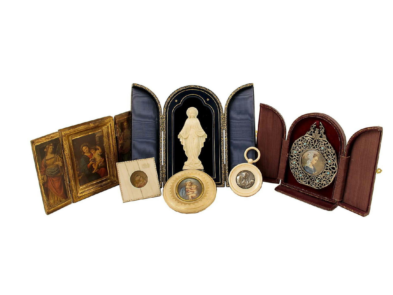 A silver plated relief roundel of the Virgin Mary with child Jesus by Tairac, mounted in an ivory frame with an open bow, 2in (5.3cm) diameter, an oval miniature of the Virgin and child, inscribed 'Mary', in a vellum frame, a circular miniature in a bone frame, a carved ivory figure of Christ standing on a snake by J. Canava, in an Italian leather triptych easel back frame, a pierced silver coloured metal frame with a print of a female saint in a leather triptych frame and a print triptych after Mignard. (6)