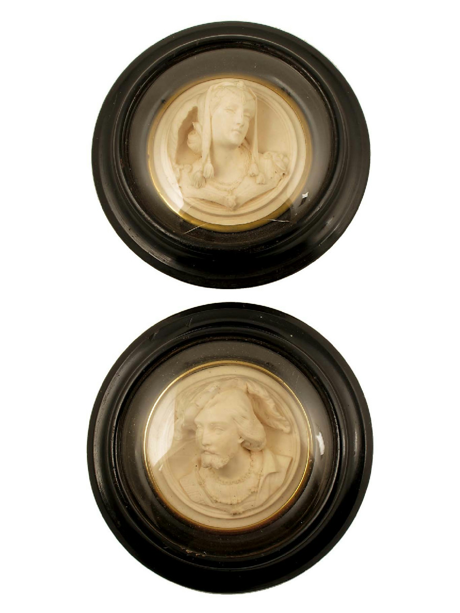 A pair of 19th century plaster relief bust rondels, of a young King and Queen, he wearing The Order of the Golden Fleece and she with a pendant initialled 'AS', indistinctly signed 'Gt Belloqary 1859', 5in (12.6cm) dia, in ebonised frames. (2)