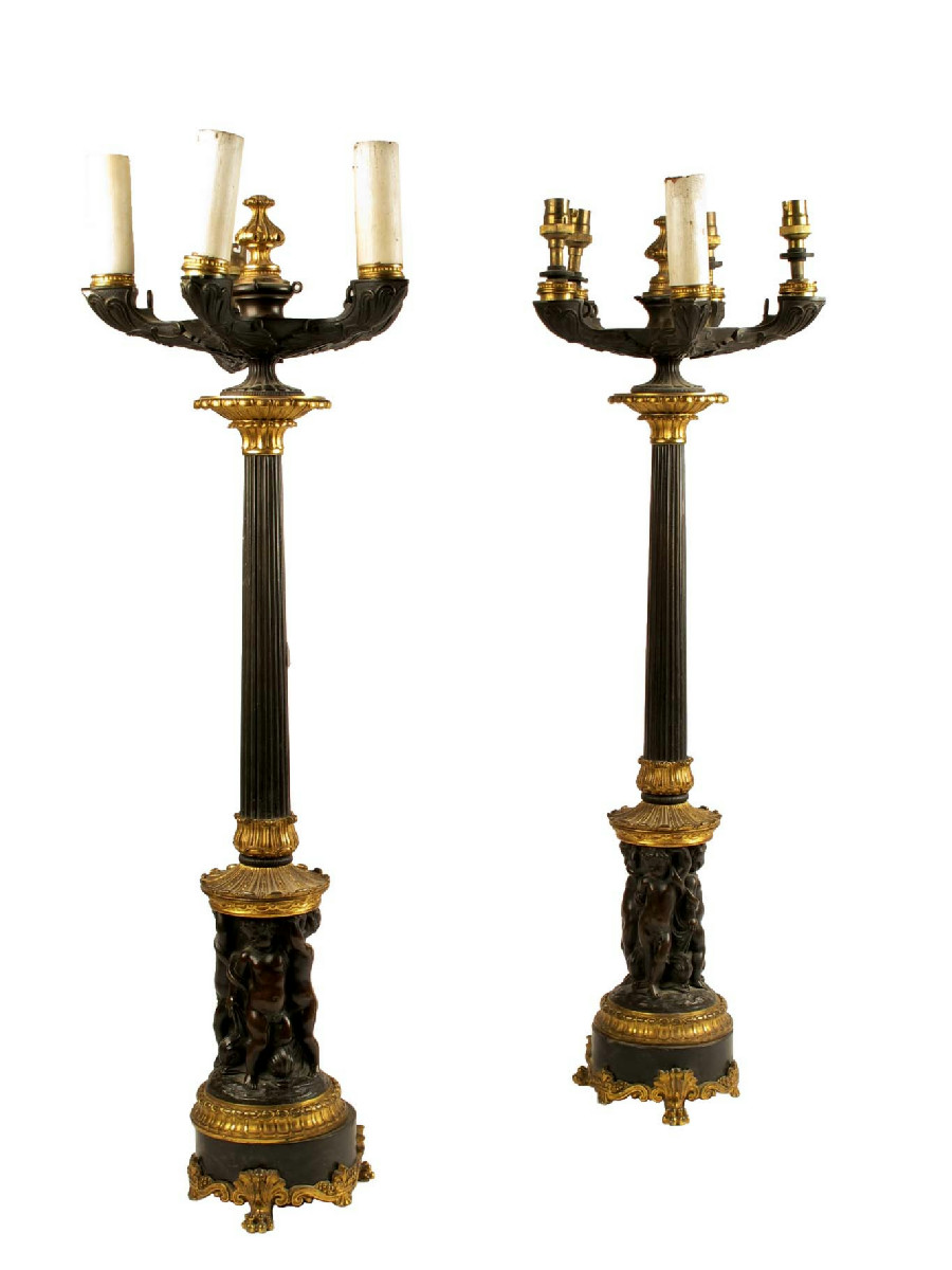 A pair of 19th century bronze and ormolu five light candelabra, each with a leaf capped classical lamp above a reeded column supported by cherubs and dolphins to a black marble base and cast paw feet, later fitted for electricity, 26½in (67.2cm) high, 9¼in (23.5cm) wide. (2)