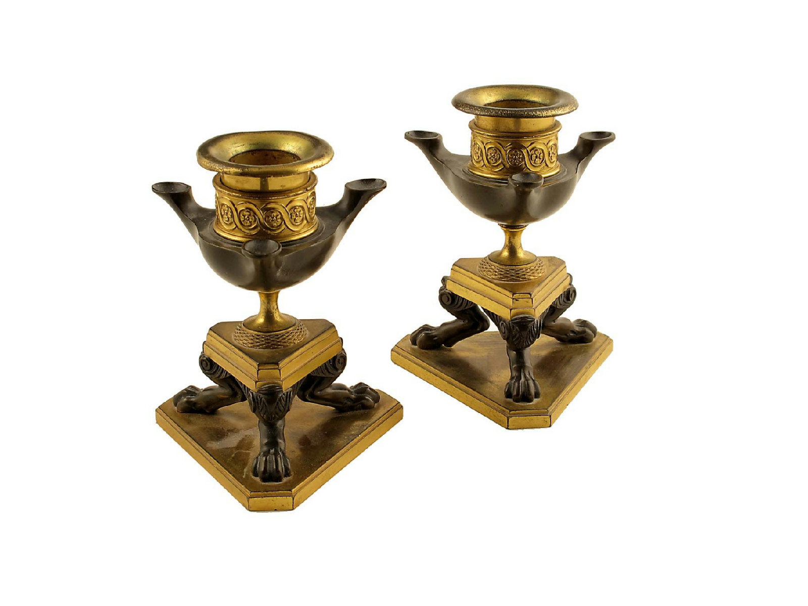 A pair of Restauration ormolu and bronze candlesticks, with detachable sconces, 4½in (11.5cm) high. (2)