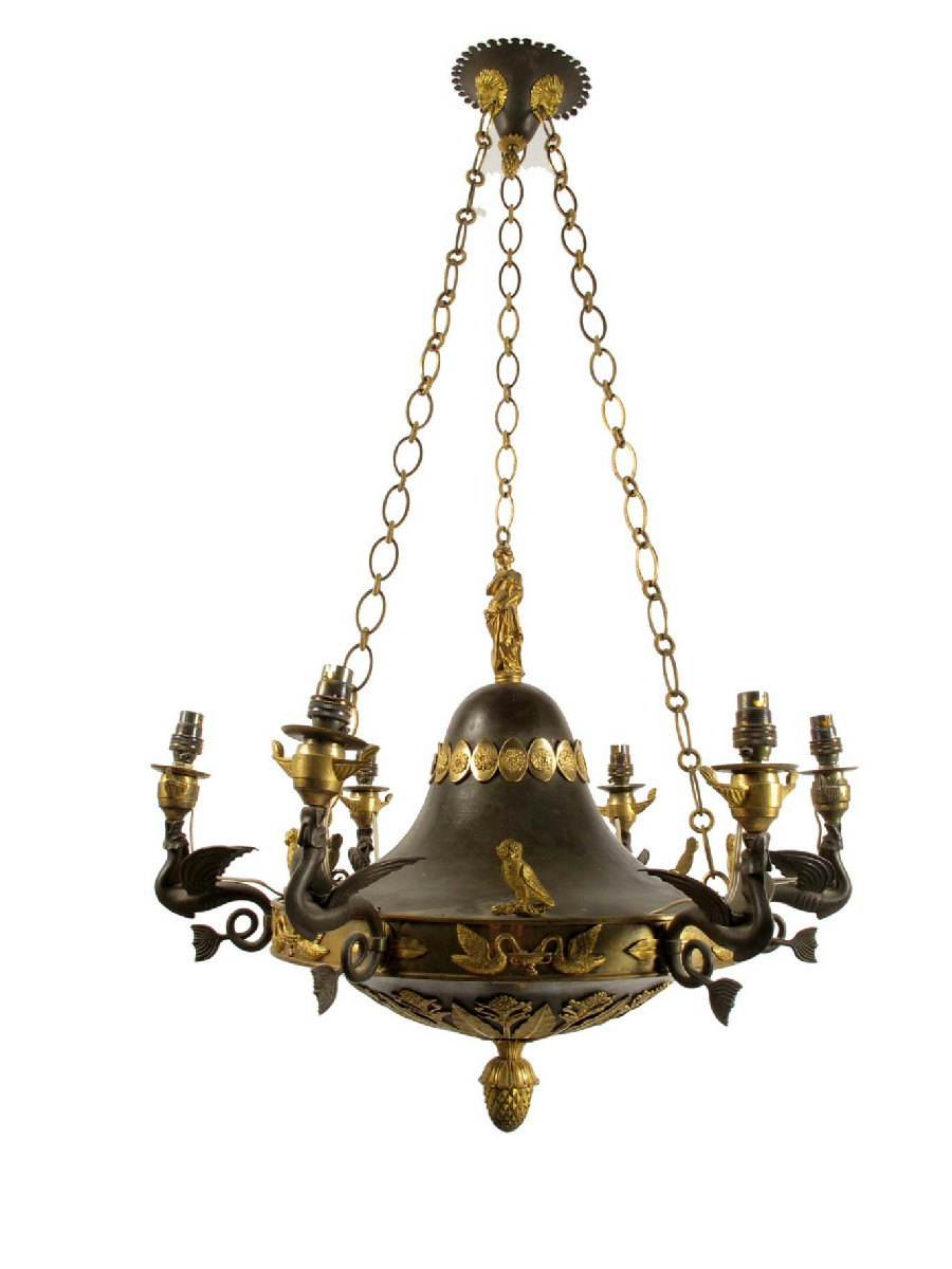 A 19th century bronze and ormolu six branch ceiling light, later fitted for electricity, with a female figure finial and owl outer finials, to dragon arms and hung with chains from a lion mask applied corona, 33½in (85.3cm) high, 20½in (52cm) wide.