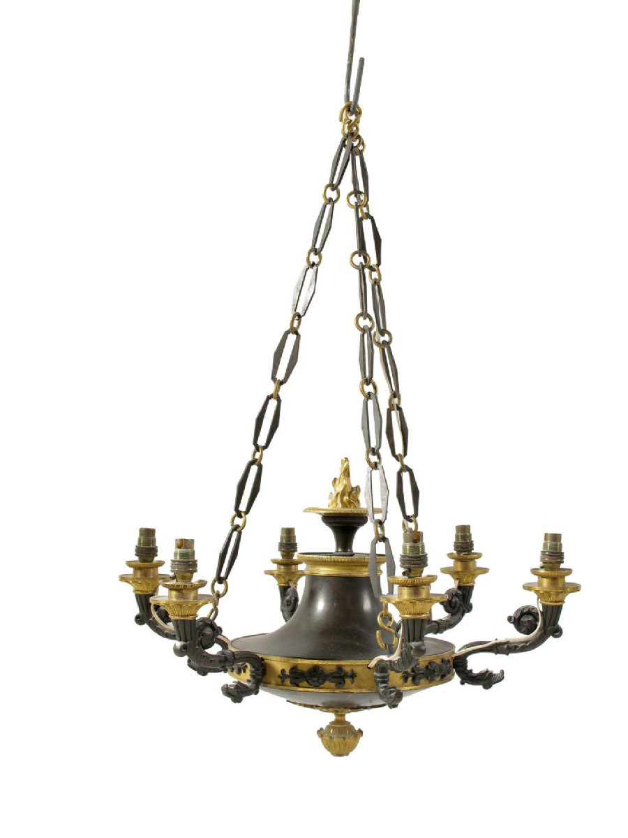 A 19th century bronze and ormolu six branch ceiling light, with a flaming finial and scroll branches with mask terminals, with chains, 27in (68.5cm) high, 18½in (47cm) wide.