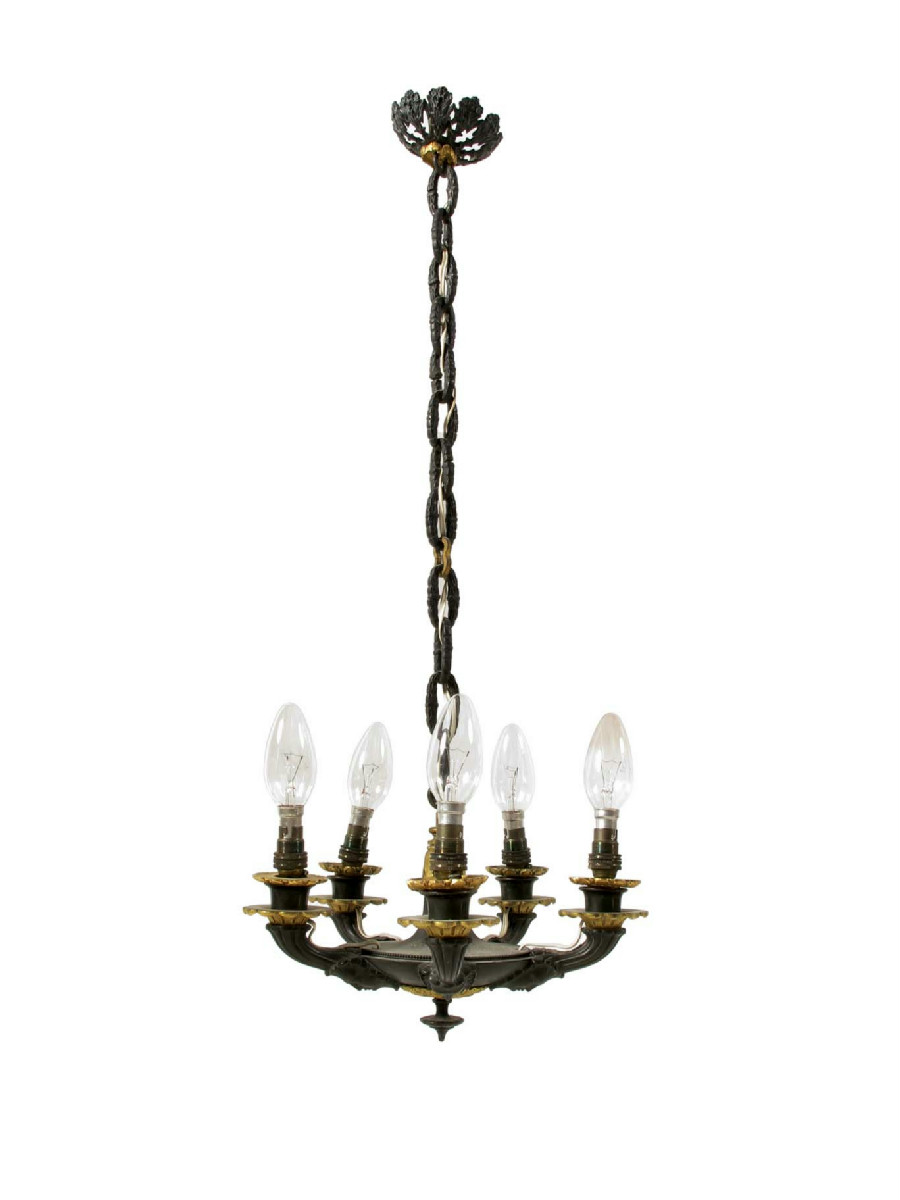 A 19th century bronze and ormolu five branch ceiling light, with human mask terminal, with laurel wreath chain and floral boss, 28¾in (73cm) high, 11in (28cm) wide.
