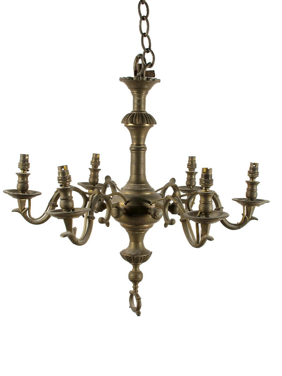A 19th century Dutch brass six branch chandelier, with detachable arms, drilled for electricity, with an open ring pendant, 21½in (54.5cm) high and wide.