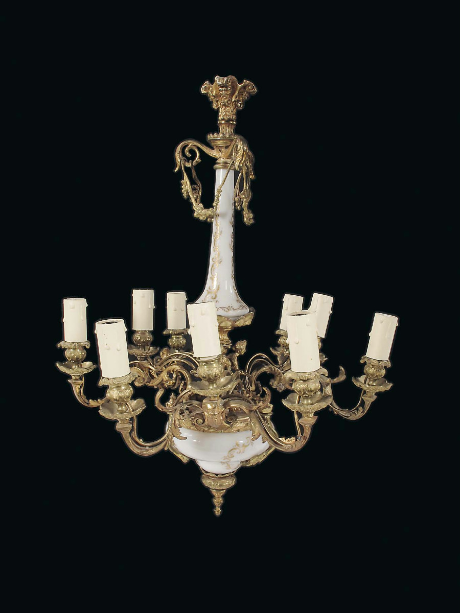 A gilt brass and opaque glass nine light chandelier