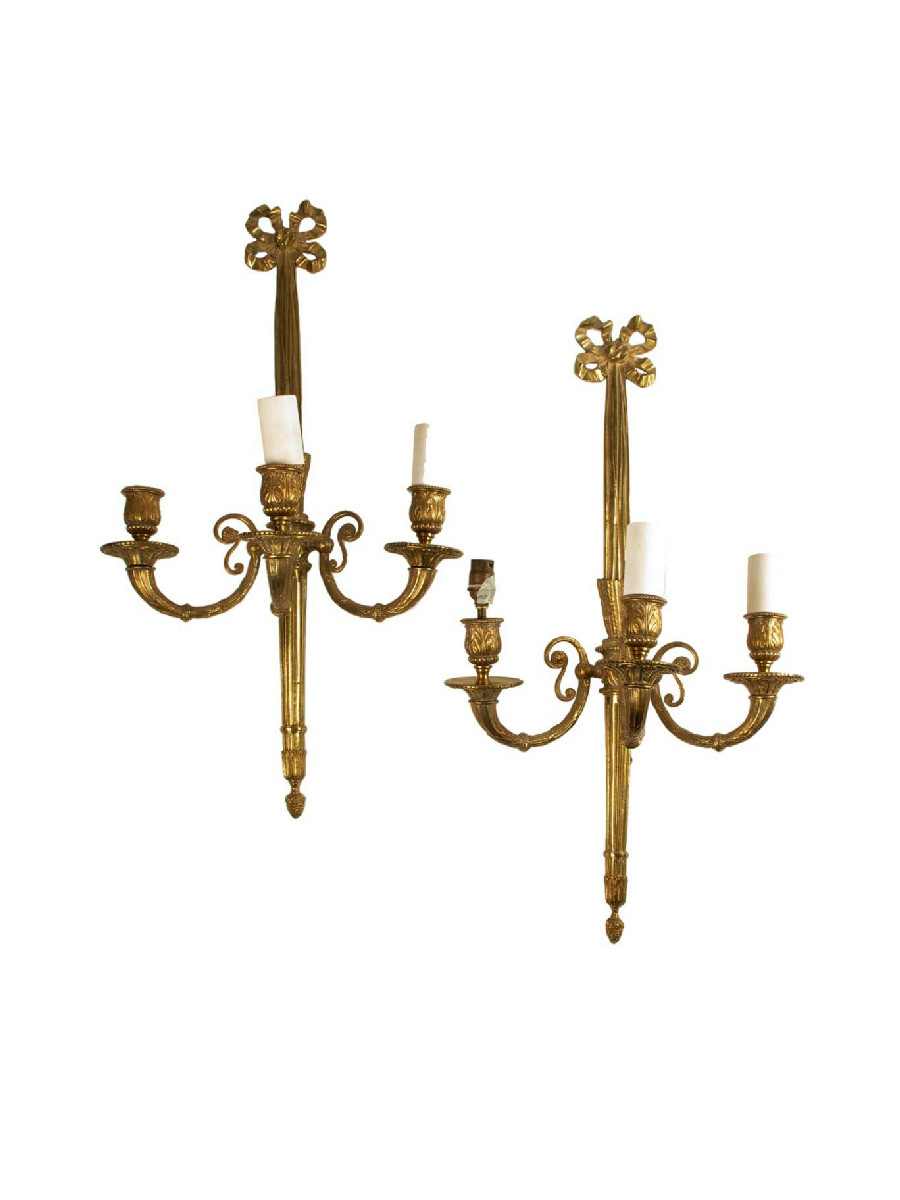A pair of Louis XVI style three branch wall lights early 20th century, 28¼in (71.4cm) high, 15¼in (38.7cm) wide. (2)