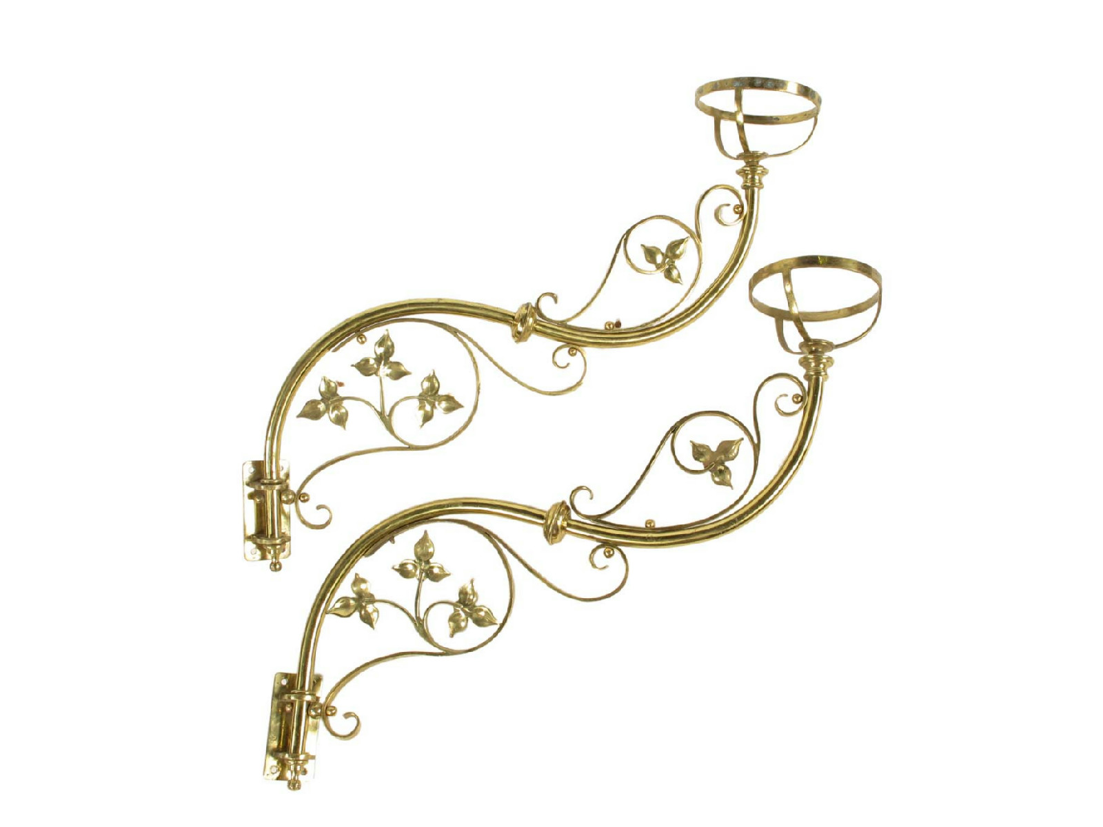 A pair of late Victorian brass wall brackets, each with a hinged scroll arm decorated with ivy leaves and with an open holder, 27½in (69.7cm) wide. (2)