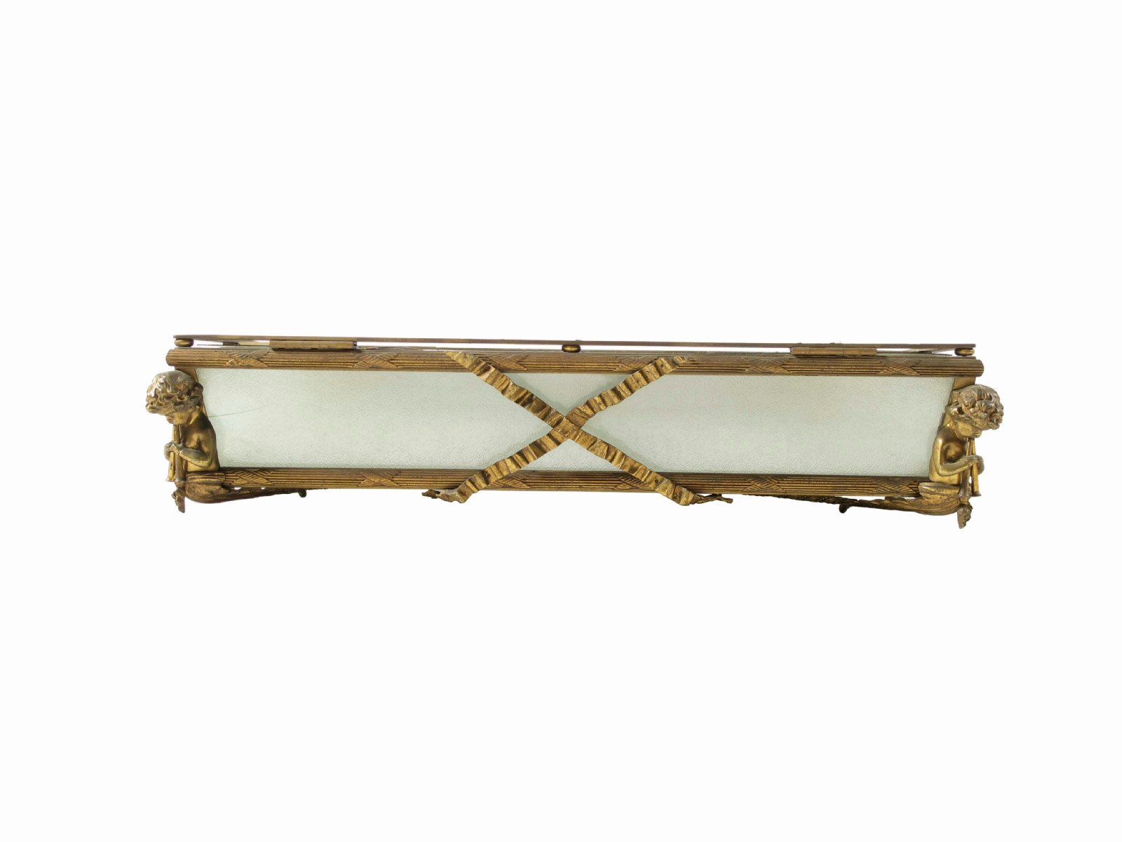 A French triple light gilt brass and frosted glass plafonnier, the corners with cherubs playing flutes, 5¼in (13.3cm) high, 25½in (64.7cm) wide, 19½in (49.5cm) deep.