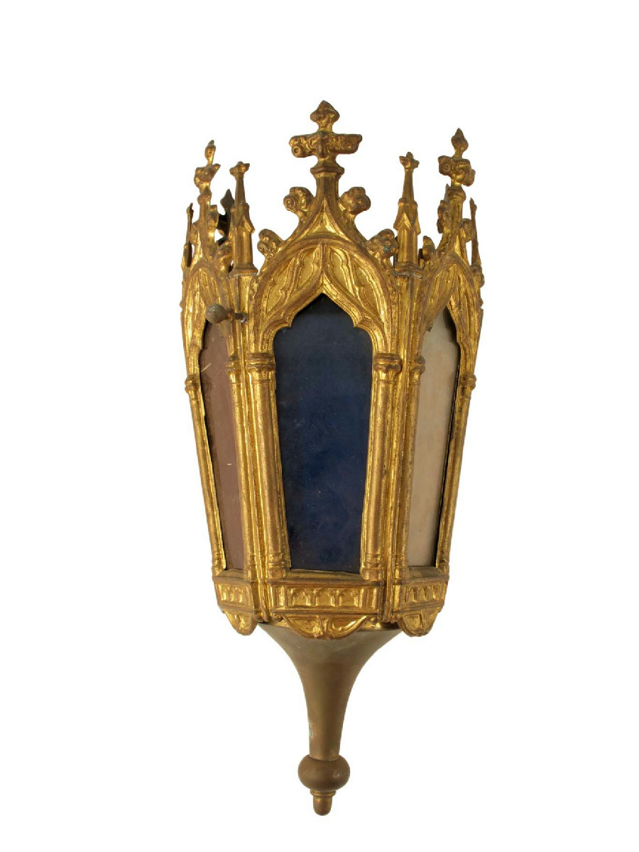 A Victorian gilt metal and stained glass Gothic lantern, 16½in (42cm) high, 8in (20.3cm) wide, on a pole. (2)