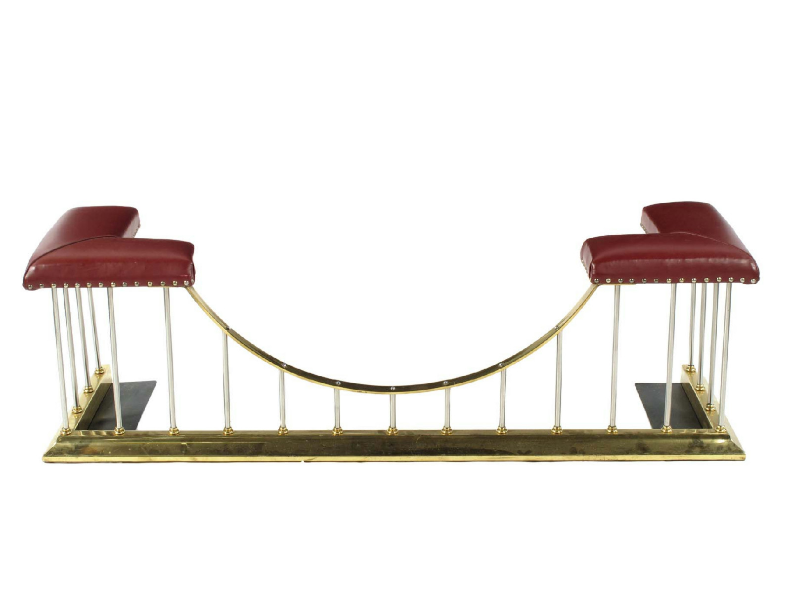 A brass and leather club fender, 18¾in (47.6cm) high, 61¾in (157cm) wide, 19in (48.2cm) deep.