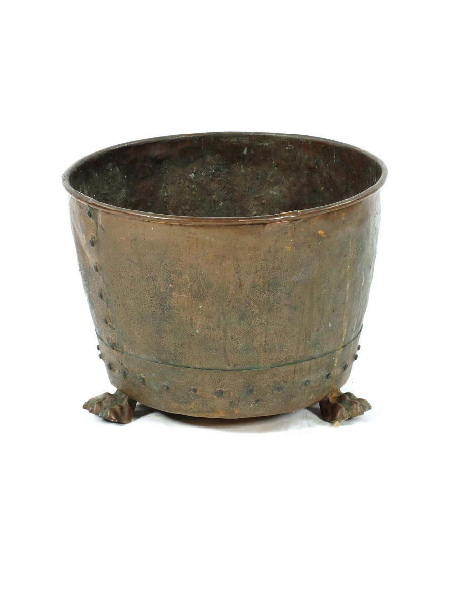 A copper and brass mounted log bin, 16¼in (41.3cm) high, 18½in (47cm) diameter and another copper log bin. (2)