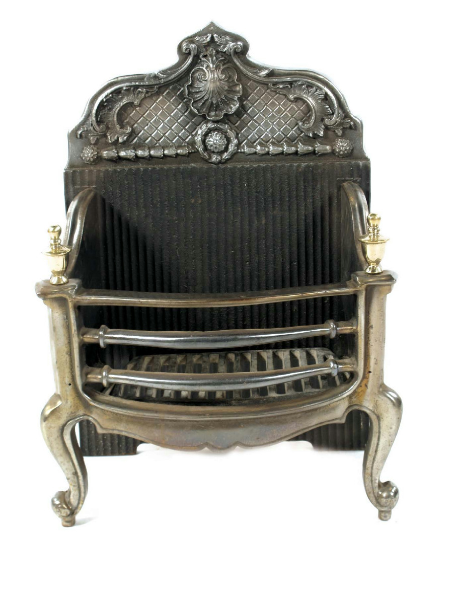 A polished iron and brass firegrate, 26in (66cm) high, 19in (48.3cm) wide, 10½in (26.7cm) deep.