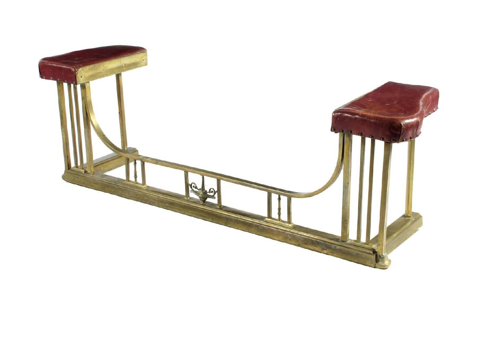 An Edwardian brass and leather club fender, 19¼in (49cm) high, 60in (152.5cm) wide, 16in (40.6cm) deep.