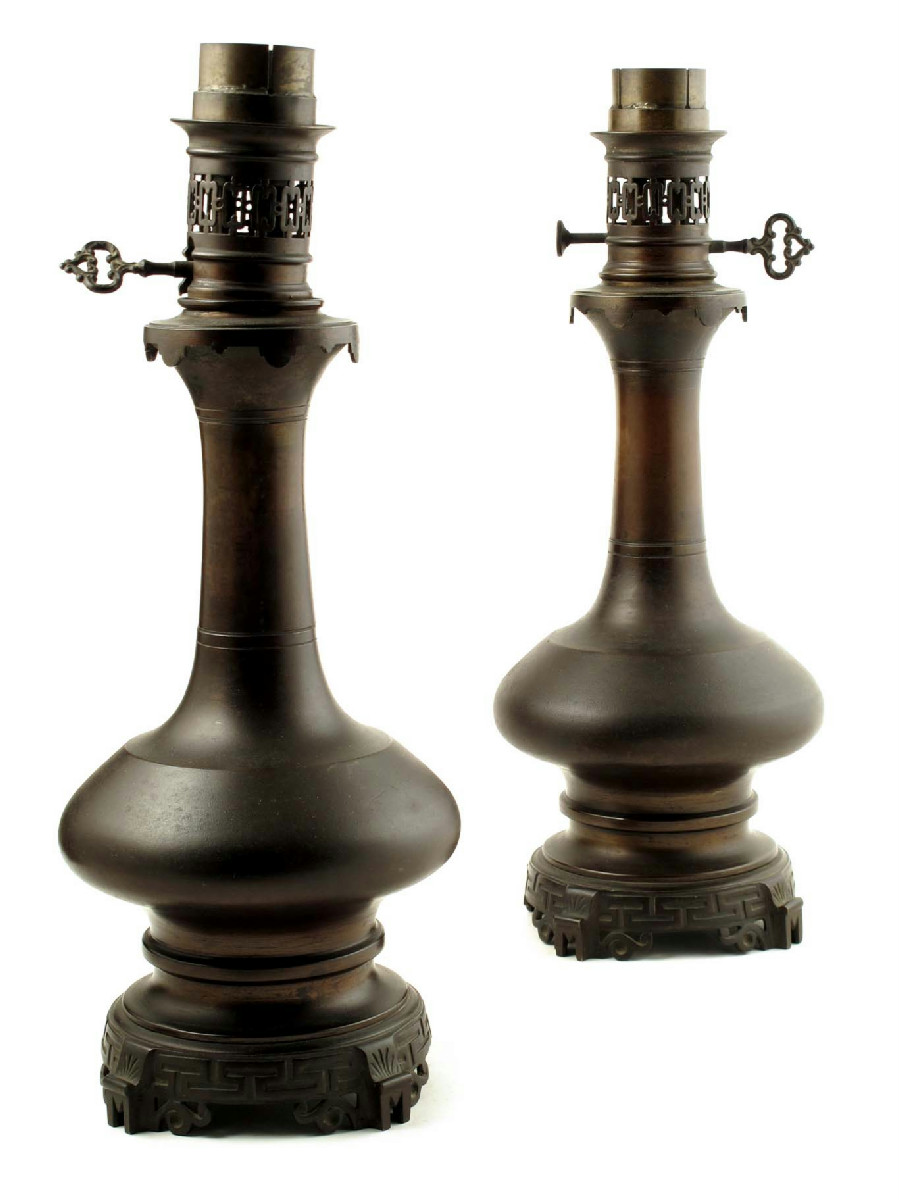A pair of late 19th century French bronze oriental style oil lamps, converted to electricity, 15¾in (40cm) high, 6¼in (15.8cm) wide. (2)