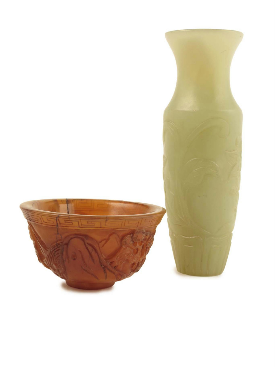 A Chinese horn bowl, carved with buildings in a rocky landscape, 2in (4.7cm) high, 3½in (8.7cm) diameter, and a Chinese celadon jade vase, relief carved with flowers and foliage. (2)