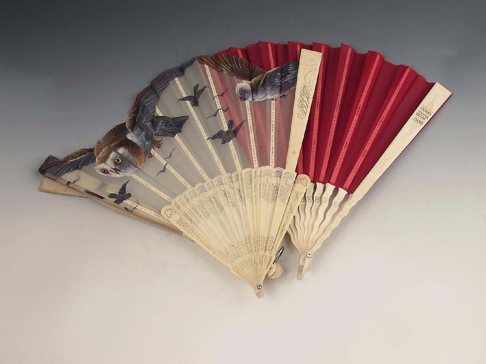 A French carved ivory fan, with a shaped gauze leaf hand painted an owl and other birds, 26in (66cm) wide, open, a carved ivory fan with red gauze leaf and a small ivory brise fan. (3)