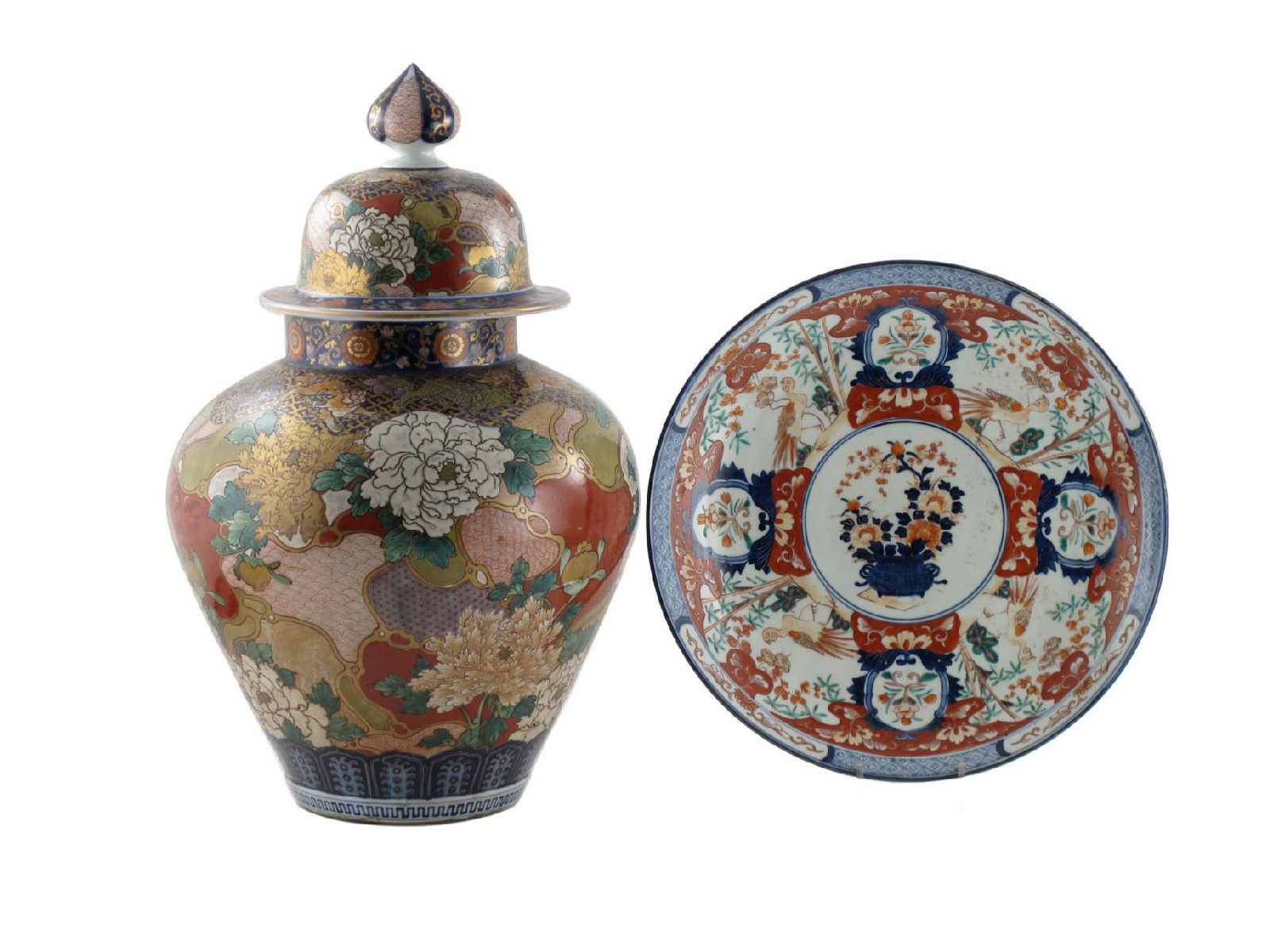 A large Japanese Imari baluster vase and cover 19th century, brightly decorated with peony in enamels and gilding, together with an Japanese Imari charger, 21¾in (65cm) high, max. (3)