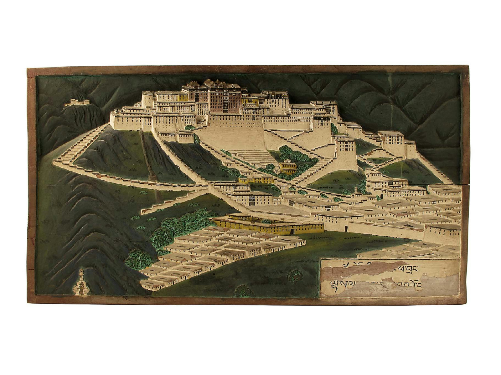 A relief carved and polychrome decorated hardwood panel, depicting the the city of Lhasa and the Potala Palace, with remains of inscription, 11 x 20½in (28 x 51.5cm).