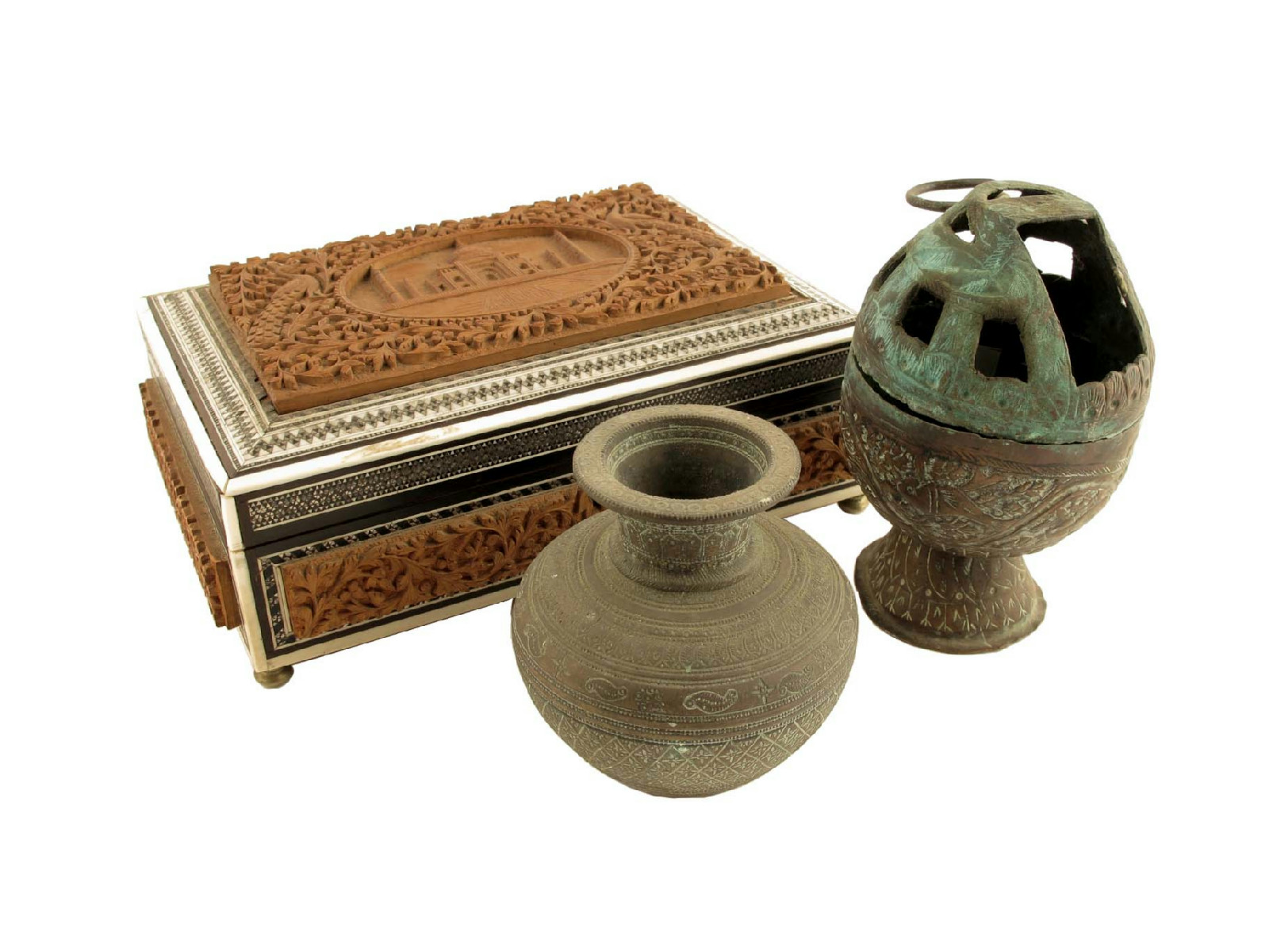 An Anglo-Indian sandalwood, sadeli and ivory jewellery box, Bombay, the hinged lid carved a view of the Taj Mahal, to a plush lined interior, 3¼in (8.3cm) high, 9½in (24cm) wide, 6¾in (17cm) deep, together with an Indian brass vase and a bronze censer. (3)