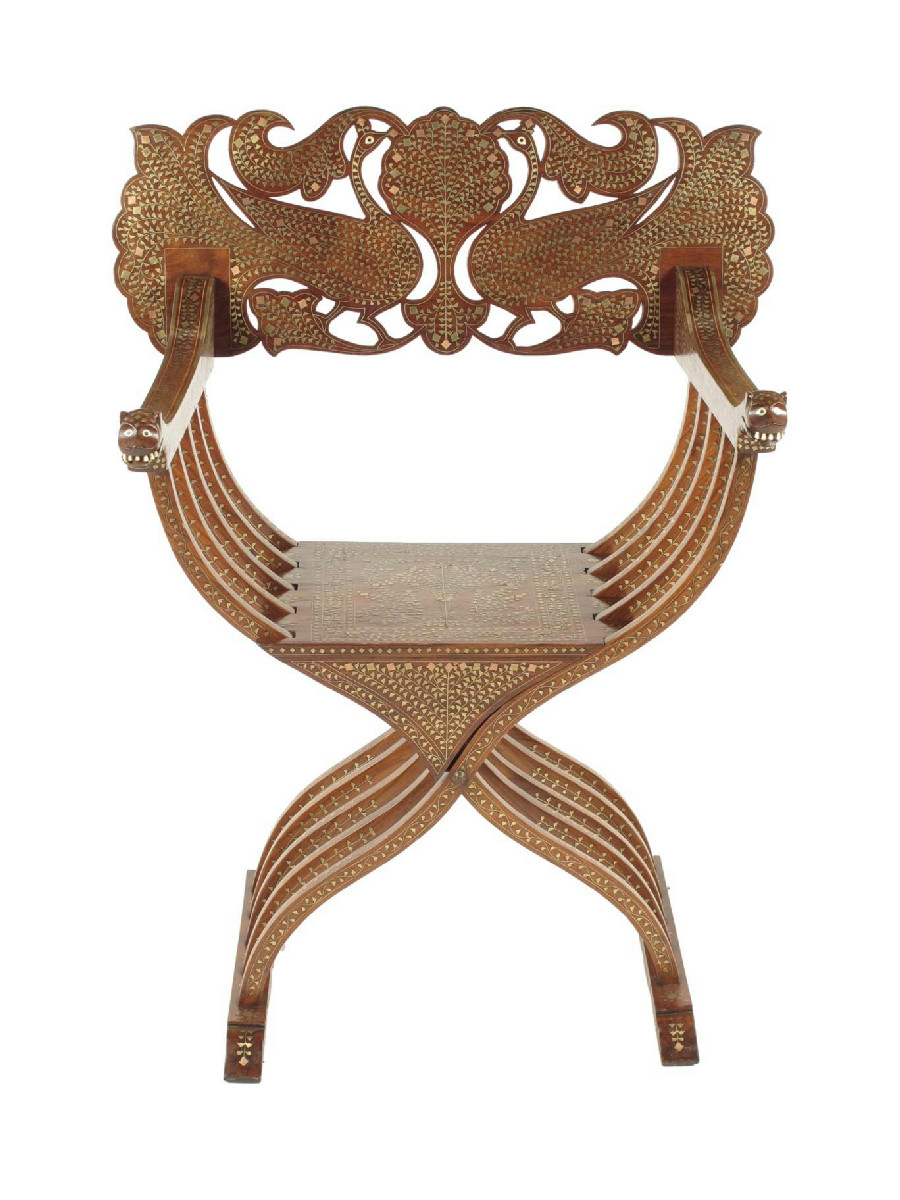 An Indian hardwood and brass marquetry folding armchair, in Savonarola style, 20th century.