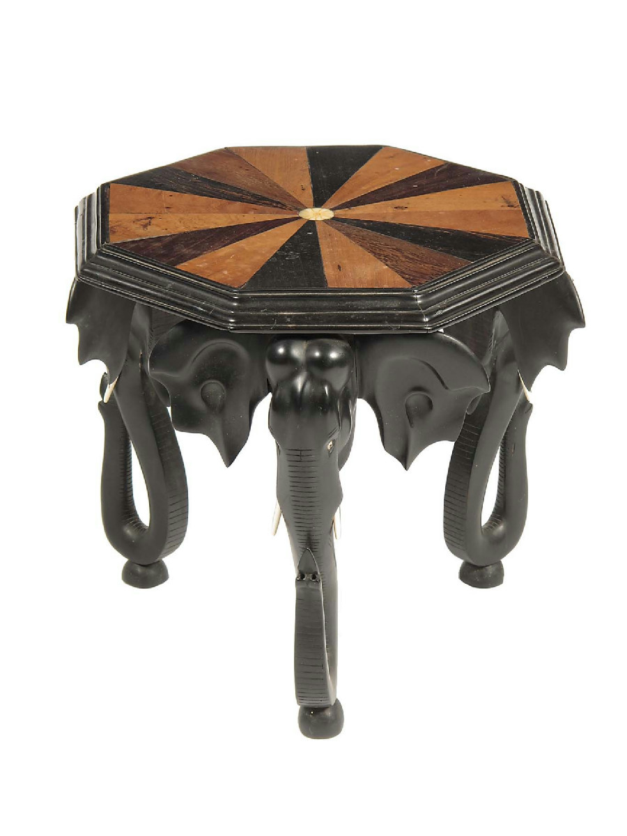 A late 19th century Ceylonese ebony and specimen wood small table, with three elephant head supports, 13½in (34cm) high, 15½in (39.3cm) wide.