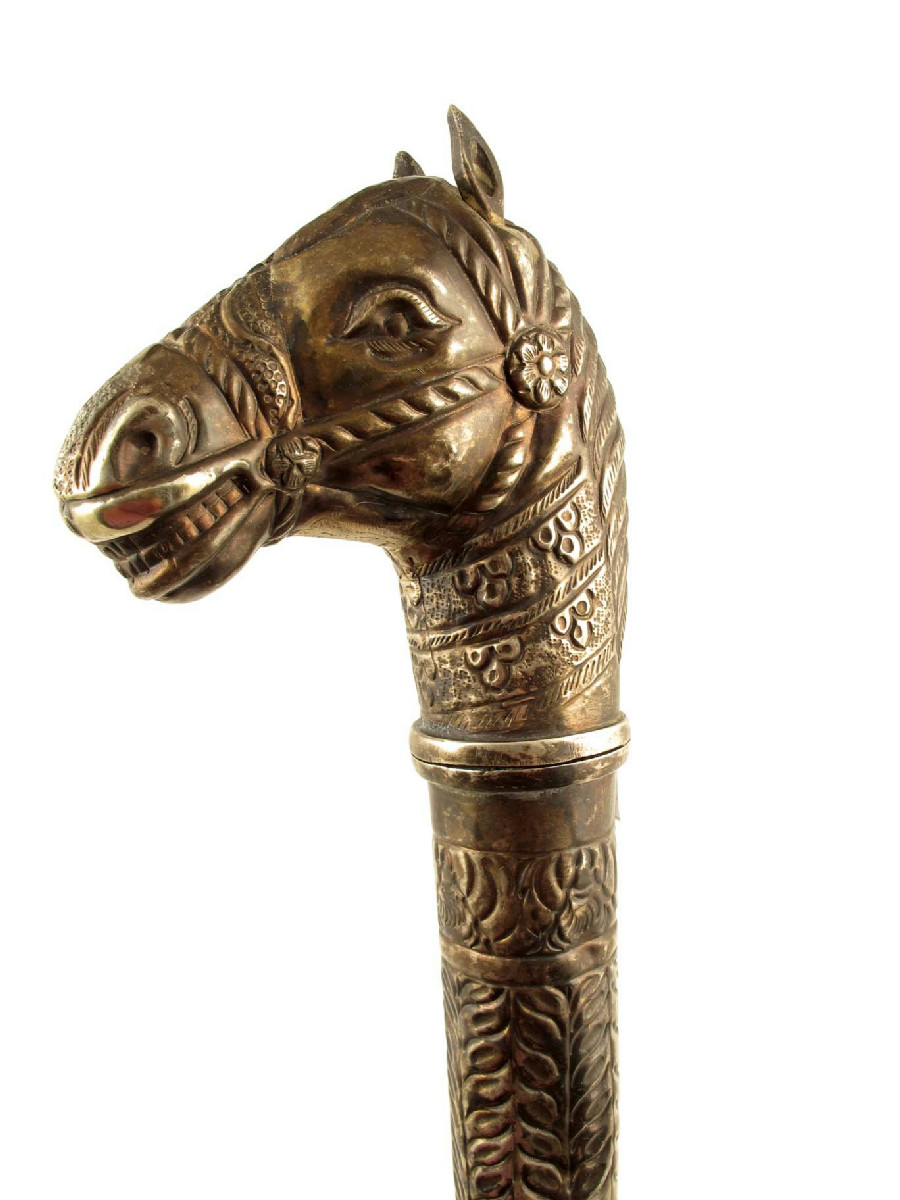 An Indian silver plated brass staff, with screw off top modelled as a horses head, early 20th century, 23½in, (59.5cm) long.