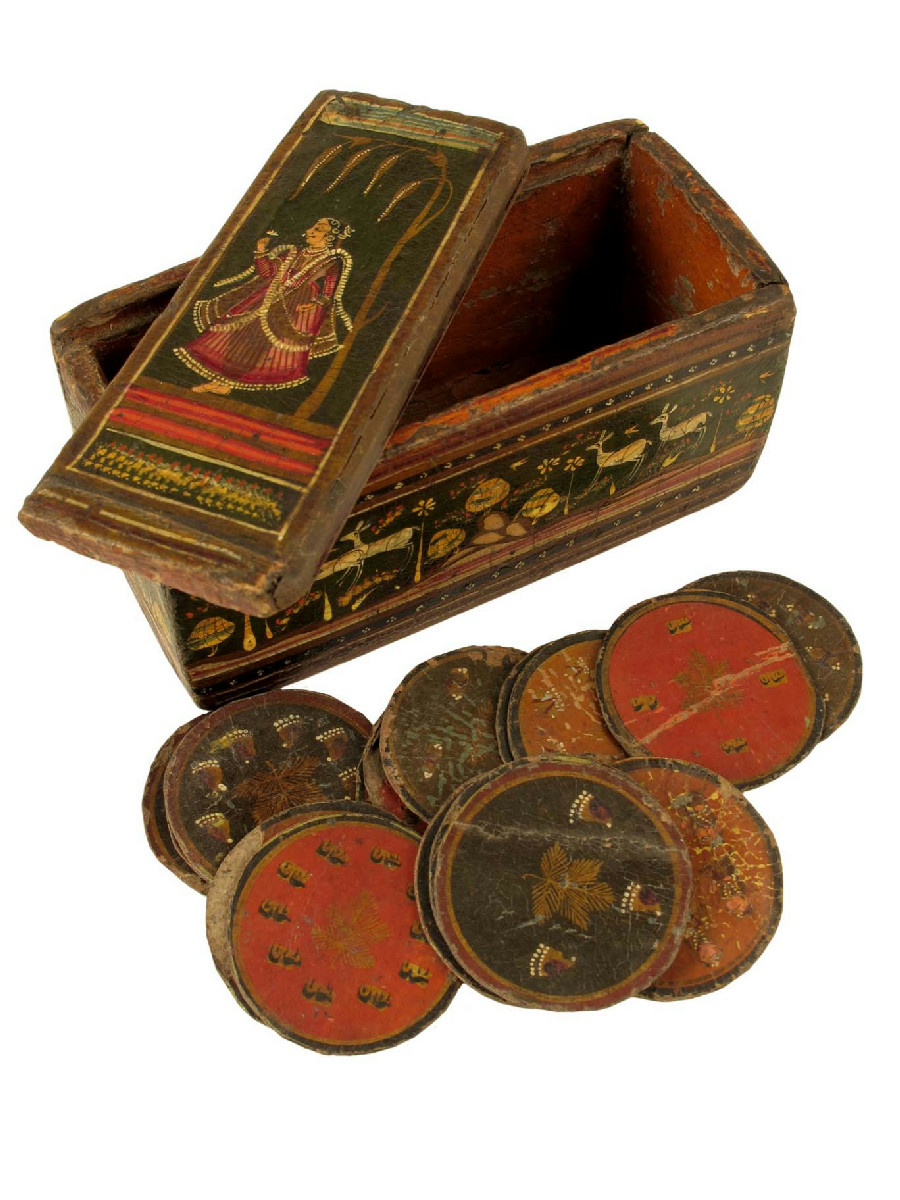 A 19th century Indian painted wood counter box, the sliding cover painted a lady, the sides with running deer, containing nineteen card counters, 5in (12.5cm) wide.