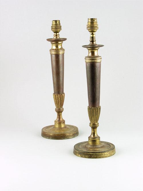 A pair of patinated brass table lamps