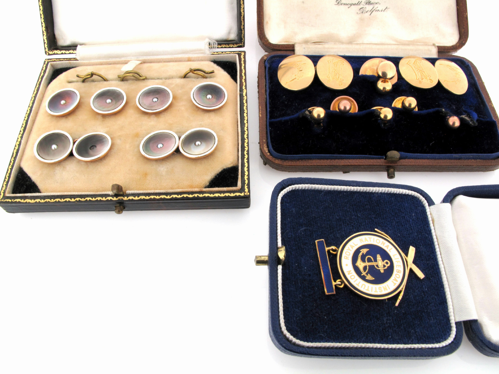 A pair of 18ct gold cufflinks, engraved with crests and initials and seven further gold dress studs, cased. A cased set of gold, shell and enamel cufflinks (missing one pearl) with a matching set of four gold links (cased). And a 9ct gold RNLI medallion, cased.