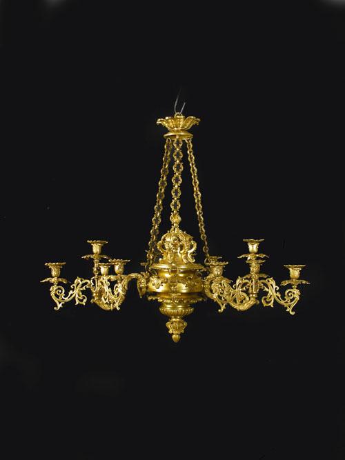 A George IV ormolu twelve light chandelier, with leaf decoration and scroll link chains, the turned body issuing three arms with further scroll branches and a central holder, 35in (89cm) h, 37.5in (95cm) w. Two central holders broken, repaired.