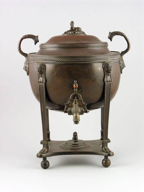 A Regency copper oval samovar, with Egyptian masks and sphinx, to liners, the brass tap stamped 'PATENT', with a stained ivory handle, 16in (40.6cm) h.