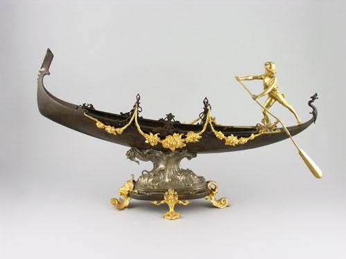 A French bronze, gilt and silvered centrepiece, the gondola with a glass liner and a boy gondolier, on a sea horse wave support to an oval base, late 19th/early 20th century, 13.25in (33.5cm) h, 23in (58.4cm) l.