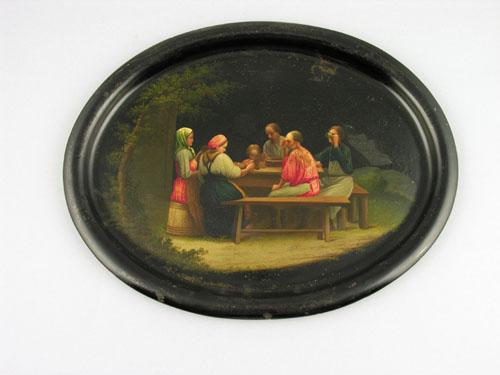 A Russian painted tole oval tray, depicting seated figures eating at a table, the reverse signed with three gilt imperial marks, 12 x 9.5in (30.5 x 24cm).