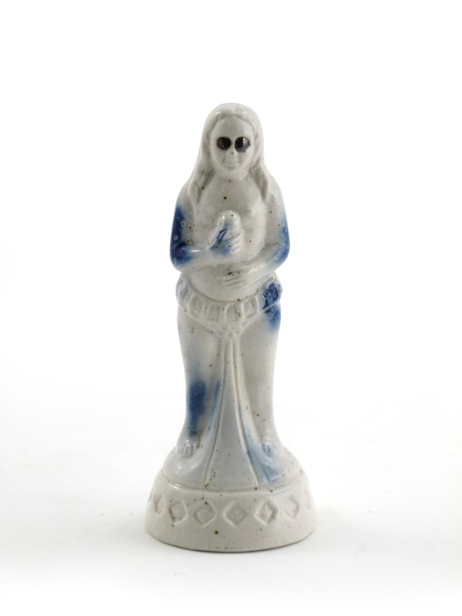 A rare salt-glazed stoneware figure of Eve c.1745, standing and holding the Forbidden Fruit to her chest, raised on a circular base impressed with a diamond design, detailed in brown and blue, 10.6cm.