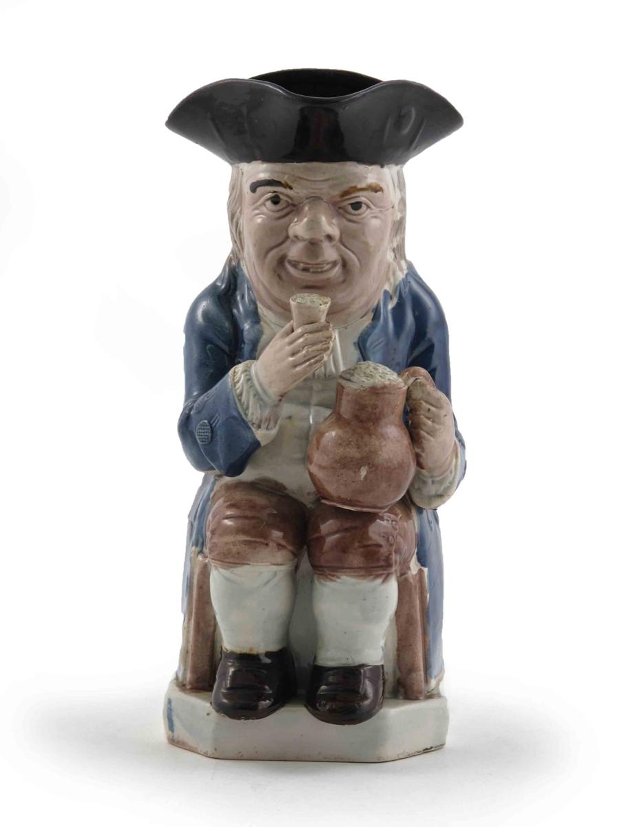 A Ralph Wood Toby jug c.1790, of Mould 51 type, resting a foaming jug of ale on his left knee, a full cup in his right hand being raised to his lips, decorated in muted enamels of blue, brown and black, a little good restoration to the hat, 26cm.