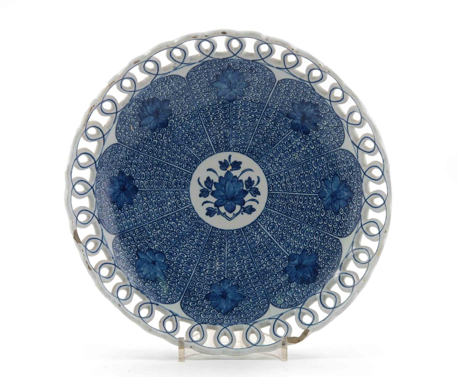 A delftware basket mid 18th century, probably Vauxhall, the well painted with a Lotus pattern of eight petals containing a lotus flower on a scrolled ground around a central lotus plant, the rim pierced with interlocking circles, raised on a low cylindrical foot, two rim chips, 26.8cm.