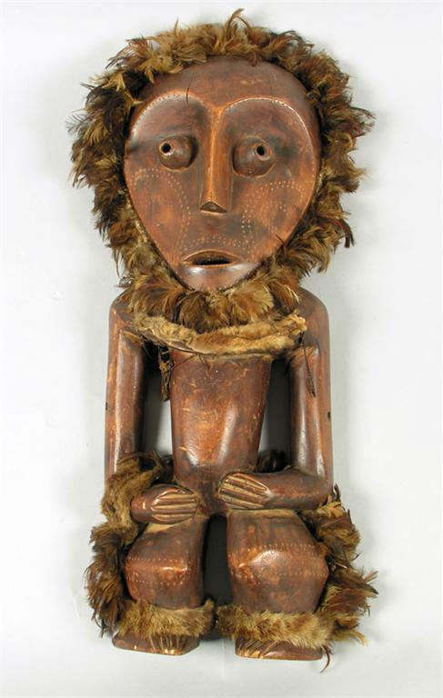 An African carved wood figure, with feather and fur adornments, 24in (61cm) h.