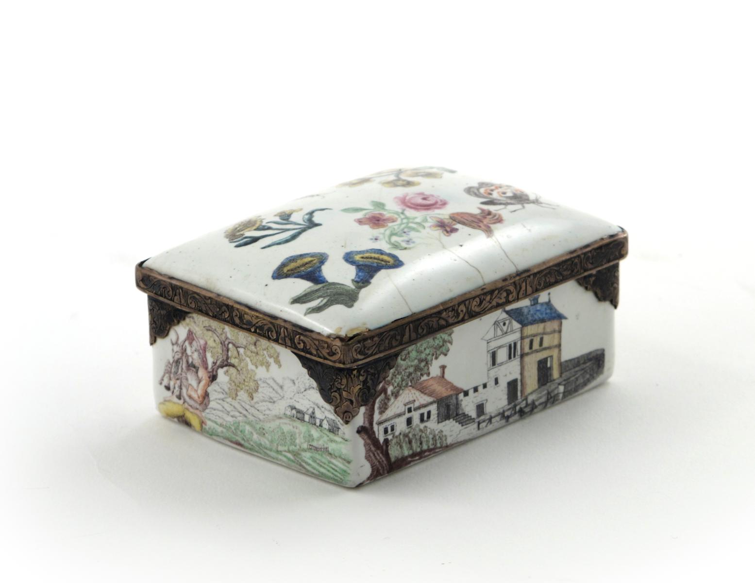 A silver-mounted enamel snuff box 18th century, the sides finely painted with landscape scenes of buildings, one with a piper, the hinged lid with flowers and flying insects, the interior painted with the portrait of a lady leaning against a plinth, the silver mounts engraved with scrolling leaves, 8.5cm.