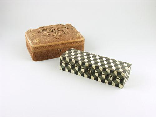 An Anglo-Indian sadelli work, ivory and ebony rectangular box, the sandalwood interior previously divided, 9.25in (23.4cm) w, and a carved walnut cigarette box, the inside of the hinged lid with a bird crest and 'Optimum Quod Evenit', 8.5in (21.5cm) w. (2)