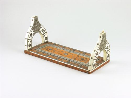 An Anglo-Indian rosewood, ivory and sadeli work sliding book stand, 5.75in (14.6cm) h, 12in (30.5cm) w, 5.25in (13.5cm) d. Damage to finials, losses to inlay, feet missing.